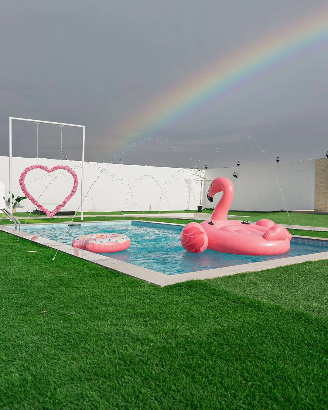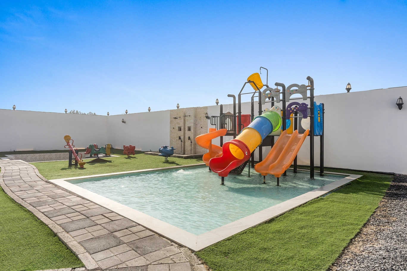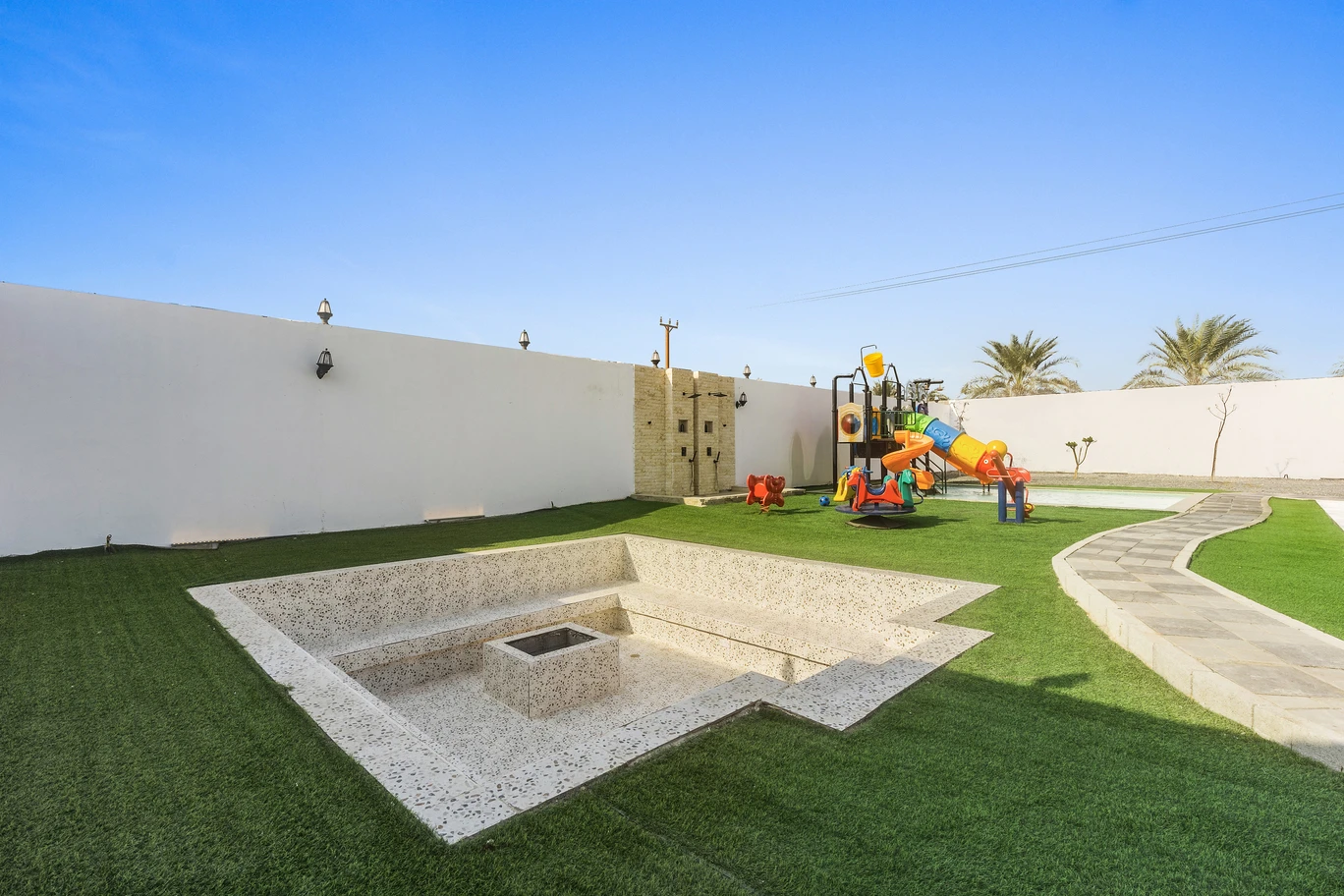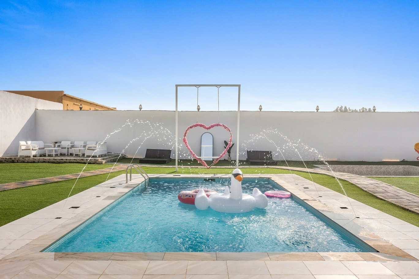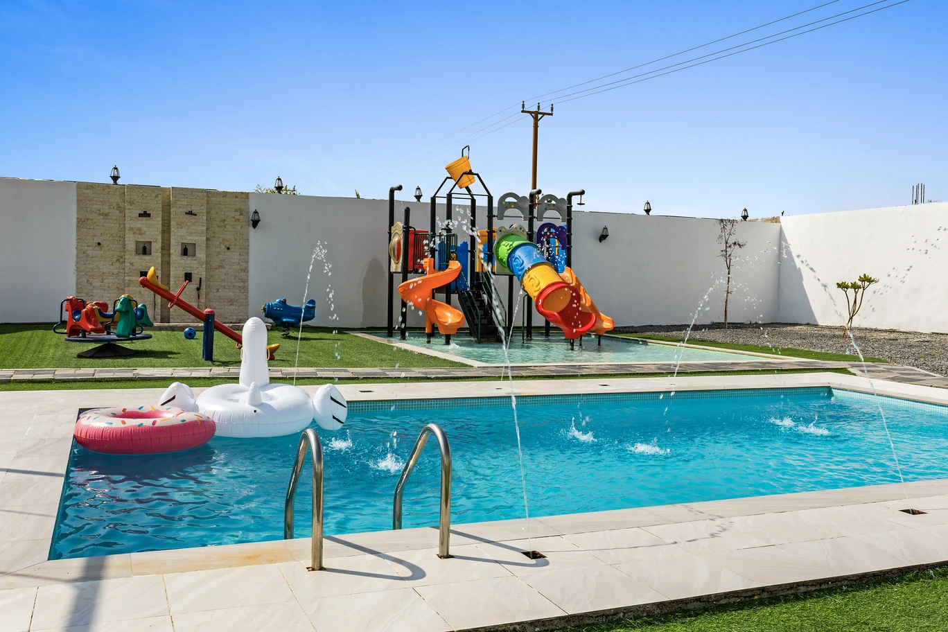 يتميز هذا المكان بحوض سباحة خاص الذي يضيف جواً منعشاً لإقامتك. بالإضافة إلى ذلك، يوجد مساحة واسعة للاستلقاء تحت أشعة الشمس والتمتع بالطقس الرائع. ولمحبي النشاطات في الهواء الطلق، ، توفر منطقة اللعب الخارجية بيئة آمنة وواسعة للأطفال للجري واللعب والاستكشاف