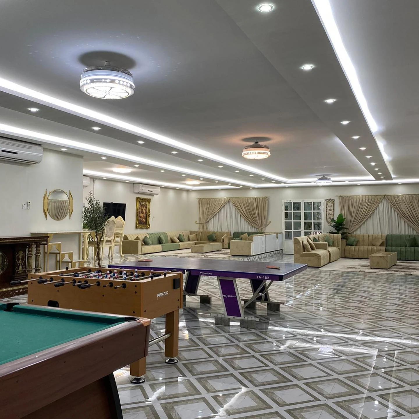 في الداخل، تتميز الفيلا بغرفتي معيشة مريحتين، وتوفر مساحات مريحة للاسترخاء والتواصل الاجتماعي. تنقسم القاعة الزجاجية الكبيرة إلى أربعة أقسام، بما في ذلك المقاعد الأرضية والمقاعد العليا ومنطقة تناول الطعام الواسعة، وهي مثالية للاستمتاع بالوجبات اللذيذة معًا. تضيف الألعاب الداخلية، مثل البلياردو وكرة الطاولة وتنس الطاولة، إلى خيارات الترفيه.