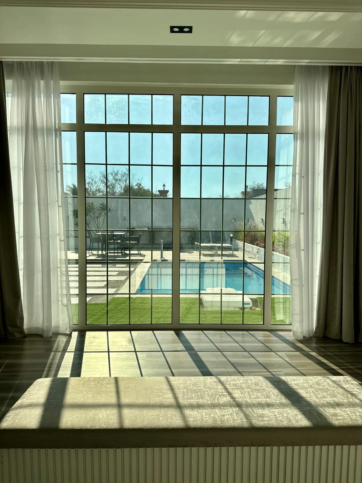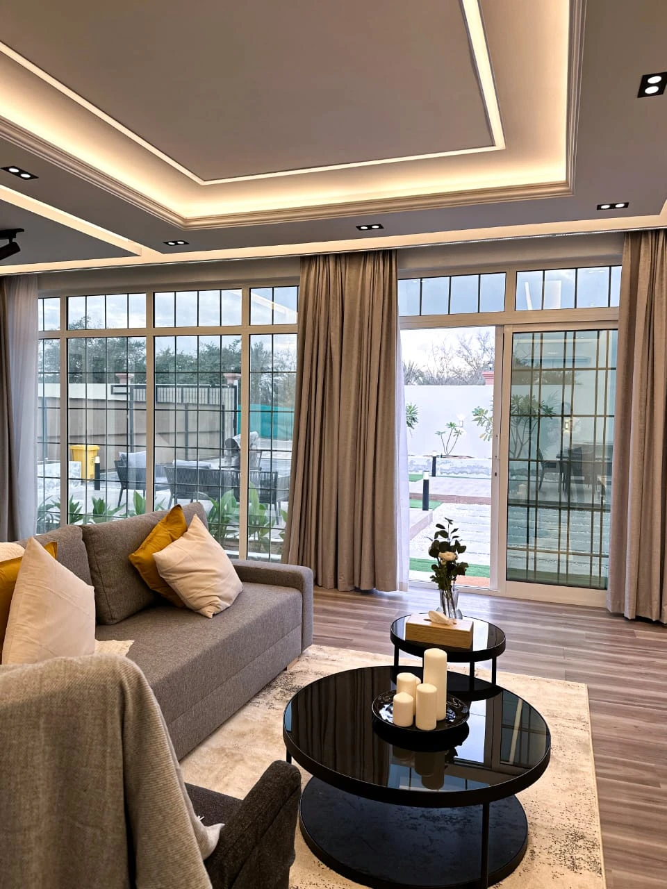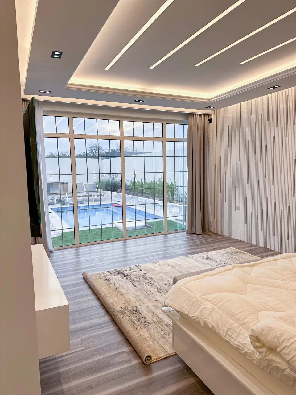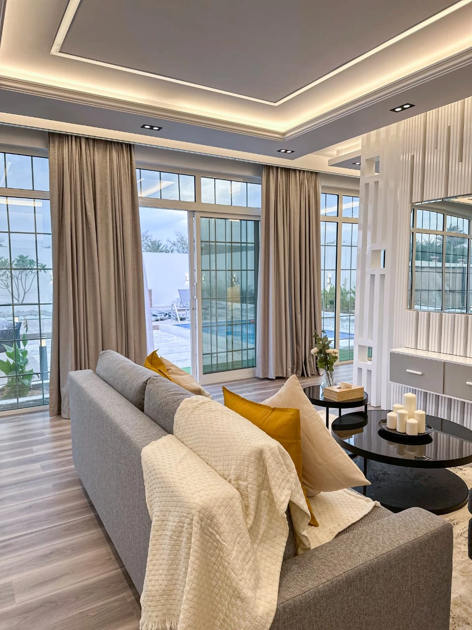 عند دخولك إلى الداخل، ستُبهر بغرفة المعيشة المصممة بأسلوب حديث وفخم، مع إطلالة خلابة تطل على حوض السباحة الجذاب. تم تصميم هذه الغرفة لتوفير أقصى مستوى من الراحة والاسترخاء، مما يجعلها المكان المثالي للاستمتاع بأوقات الاستراحة والترفيه.
