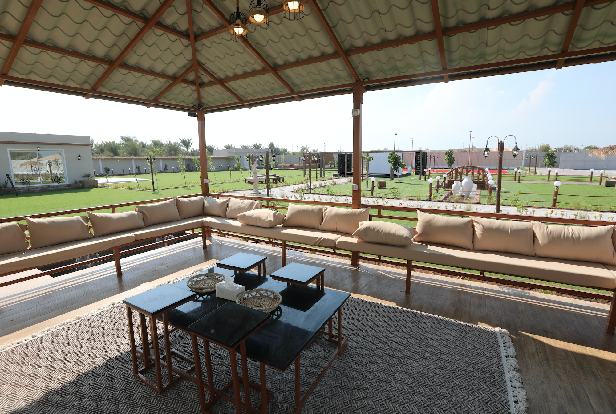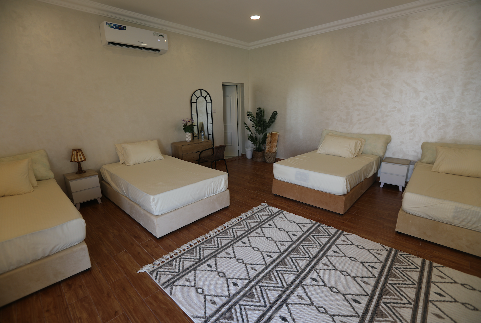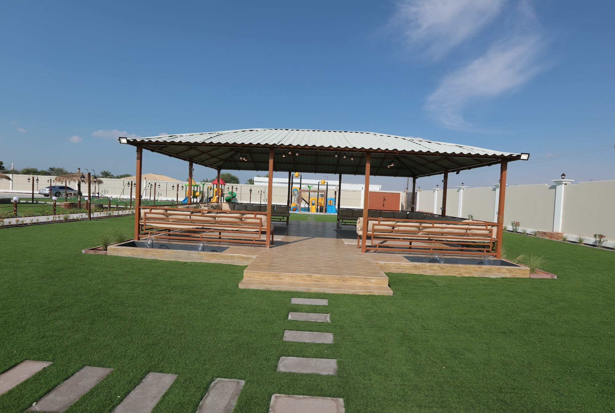تحتوي الأجنحة الأربعة الرئيسية على أماكن إقامة تتسع لـ 14 شخصًا، مع إمكانية استئجار مراتب إضافية مقابل 10 دراهم للقطعة. بالإضافة إلى ذلك، يوجد مجلس فسيح يضم مطبخًا مجهزًا بالكامل بالأواني مثل القدور والمقالي والأطباق والأكواب وفرن كهربائي وغلاية لتسخين الماء. كما يتوفر مجلس للرجال مزود بحمام وأحواض غسيل، بالإضافة إلى عدة جلسات خارجية، منها الجلسة تحت المظلة الكبيرة، وجلسة الرجال الخارجية، وجلسة السينما، والجلسة الهادئة على جسر النافورة