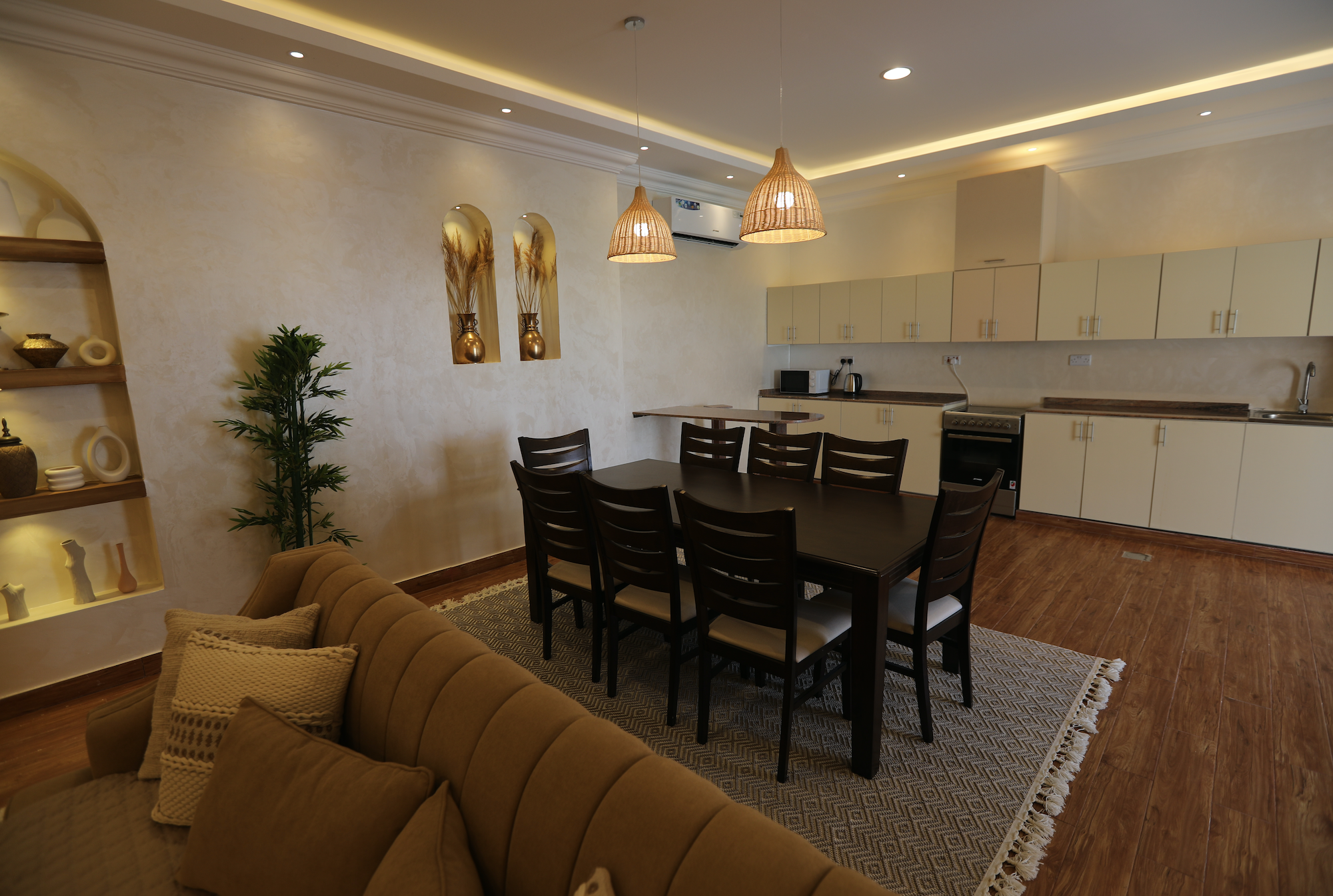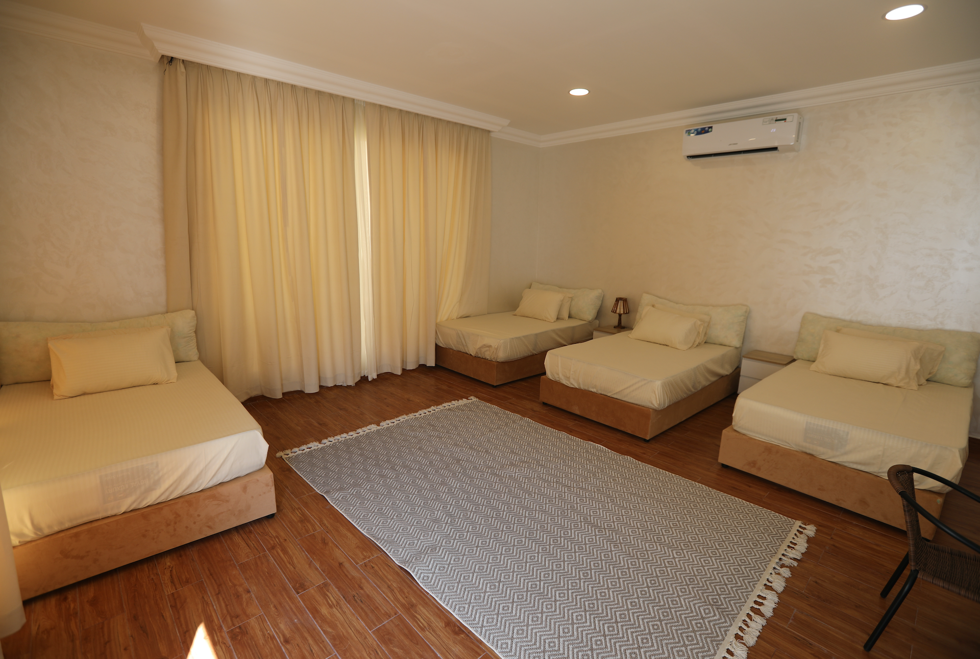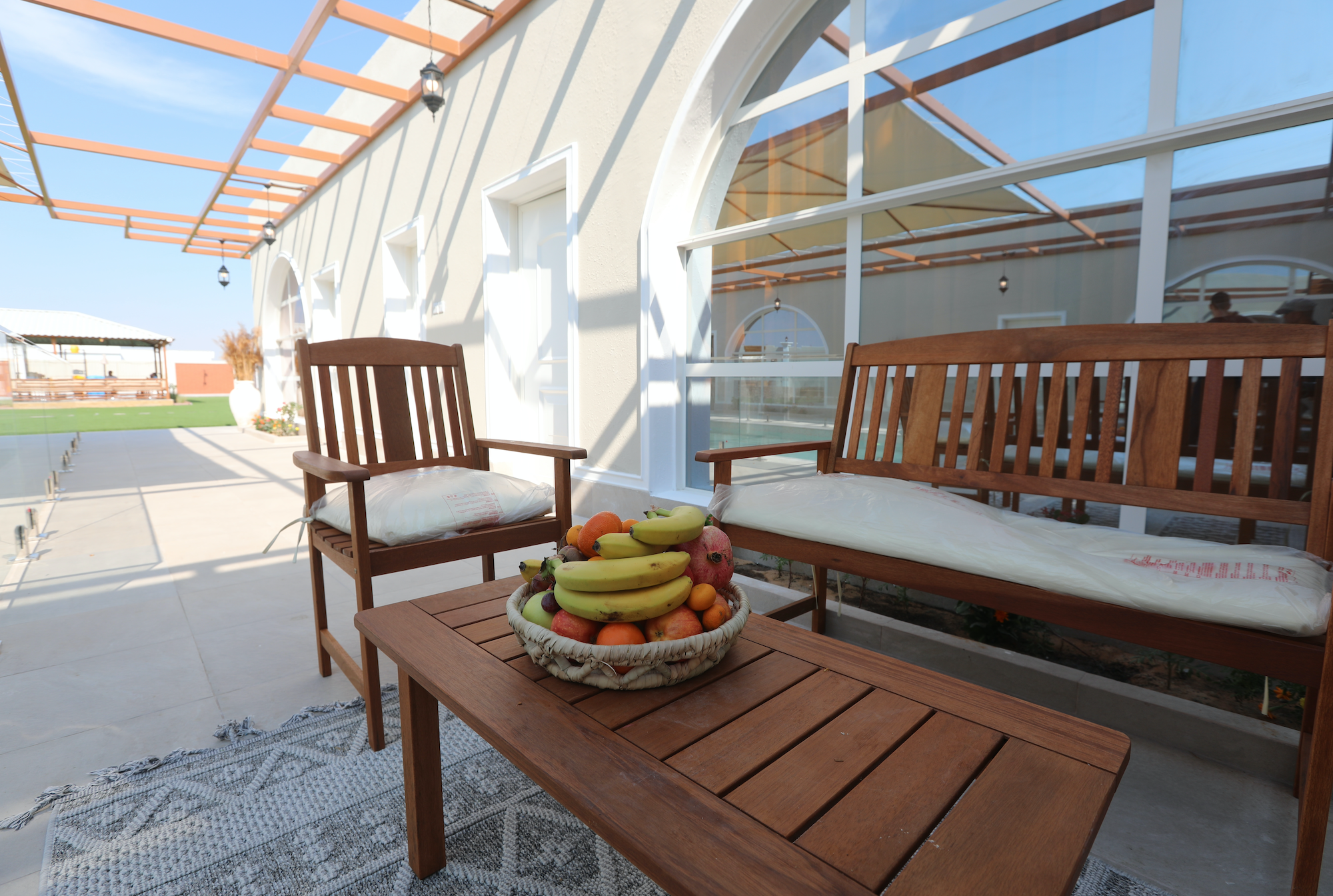 تحتوي الأجنحة الأربعة الرئيسية على أماكن إقامة تتسع لـ 14 شخصًا، مع إمكانية استئجار مراتب إضافية مقابل 10 دراهم للقطعة. بالإضافة إلى ذلك، يوجد مجلس فسيح يضم مطبخًا مجهزًا بالكامل بالأواني مثل القدور والمقالي والأطباق والأكواب وفرن كهربائي وغلاية لتسخين الماء. كما يتوفر مجلس للرجال مزود بحمام وأحواض غسيل، بالإضافة إلى عدة جلسات خارجية، منها الجلسة تحت المظلة الكبيرة، وجلسة الرجال الخارجية، وجلسة السينما، والجلسة الهادئة على جسر النافورة