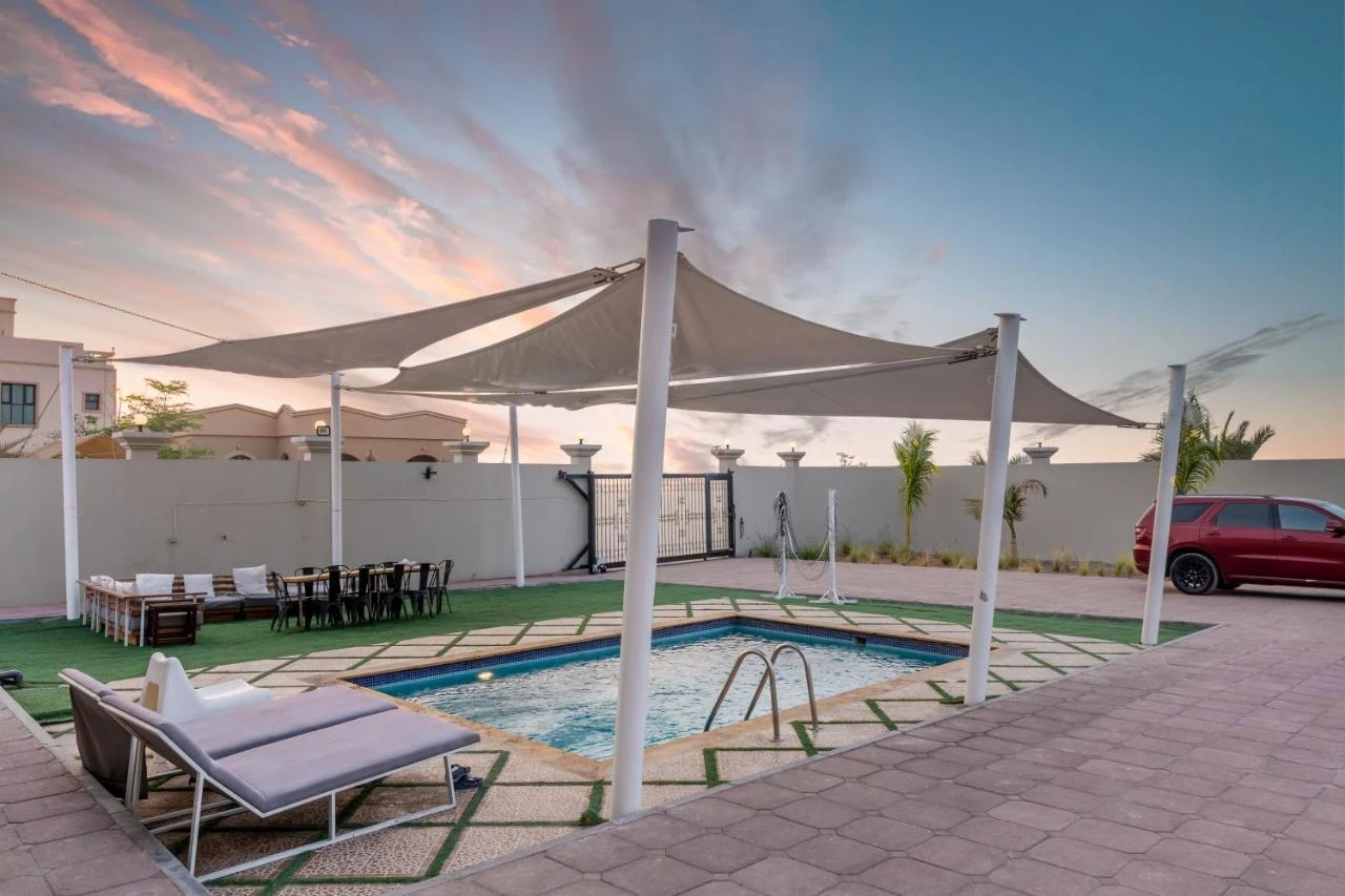 بالإضافة إلى ذلك، يتميز الشاليه بحوض سباحة خاص مع وجود ارجوحة هوائية لزيادة متعة الاسترخاء والتمتع بالوقت. كما يتميز الشاليه بوجود غرفتين نوم وغرفة معيشة واسعة ومطبخ مجهز بالكامل، بالإضافة إلى ثلاث مناطق جلوس خارجية تمنحكم مزيدًا من الهدوء والراحة.