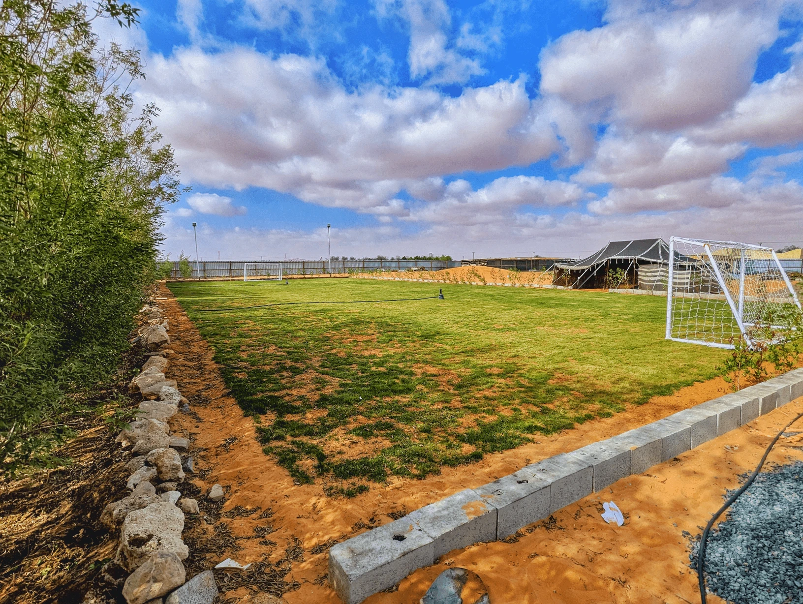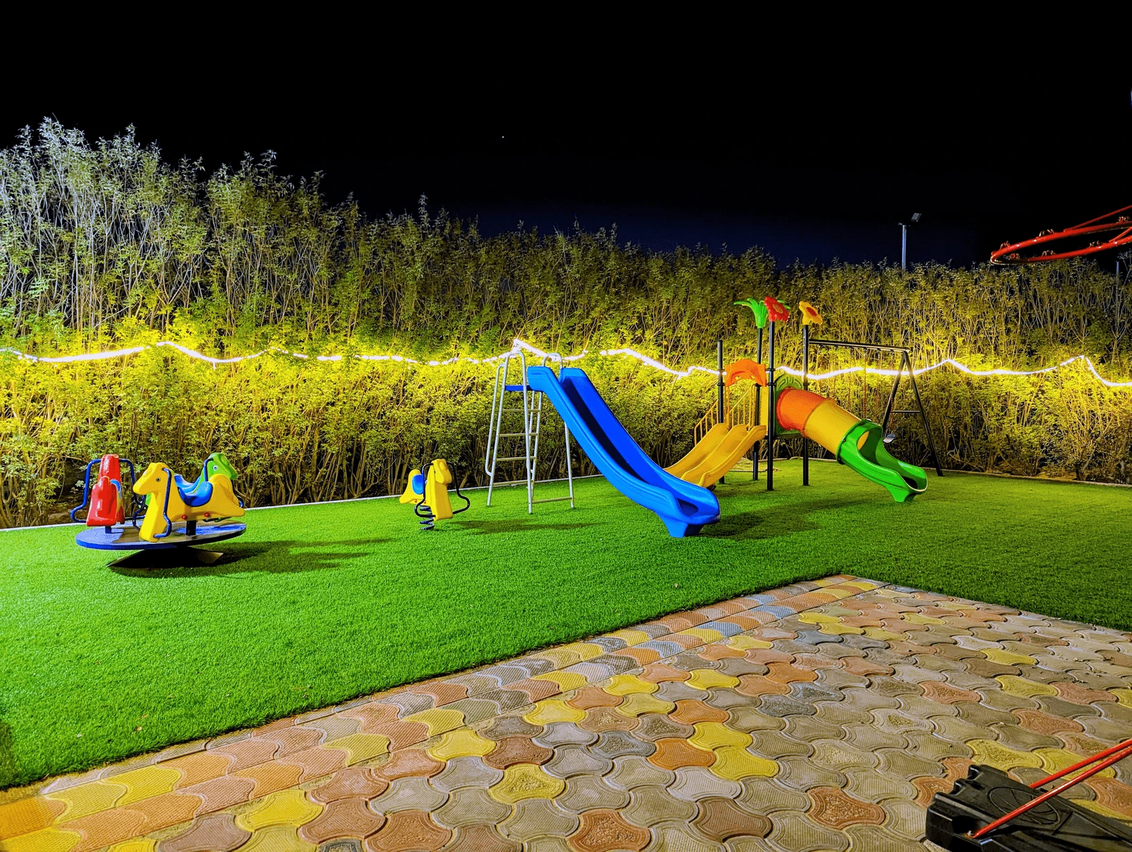 The property has a football field with lush natural grass, illuminated for evening matches. The dedicated kids' play area, surrounded by vibrant greenery, and a captivating outdoor cinema for entertainment needs for all ages. Grill enthusiasts will be delighted by the professional barbecue setup, catering to both gas and wood cooking preferences.